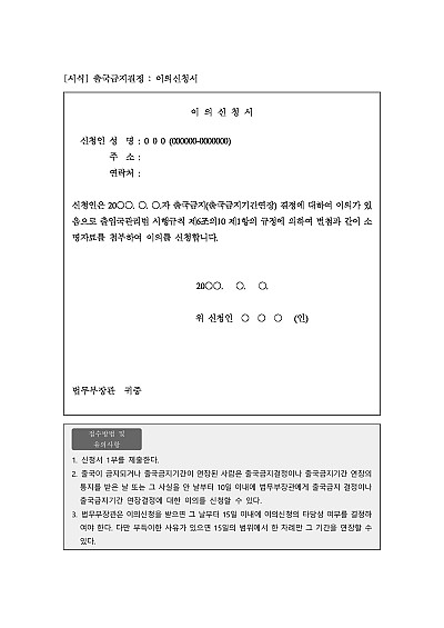 주요내용 : 수사나 재판 등의 이유로 법무부장관으로부터 출국금지 결정을 받은 경우 당해 결정에 이의를 제기하여 출국금지 조치를 해제해달고 요청할 목적으로 사용되어지는 신청서 양식임. 단 무단전재 방지목적으로 PDF 파일로 올리니, 구매하신 후 혹 원본 파일이 필요하신 분들은 톡이나 문자, 메일, 전화 등을 주시면 작성방법 등에 대한 간단한 무료상담과 함께 원본 파일을 보내드리도록 하겠습니다