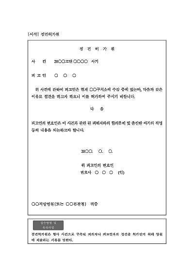 주요내용 : 구속된 피고인 등과 피해자와의 합의 등 급박한 사안논의를 위하여 법원에 접견을 허가받기 위해 제출하는 서류 양식임. 단 무단전재 방지목적으로 PDF 파일로 올리니, 구매하신 후 혹 원본 파일이 필요하신 분들은 톡이나 문자, 메일, 전화 등을 주시면 작성방법 등에 대한 간단한 무료상담과 함께 원본 파일을 보내드리도록 하겠습니다.