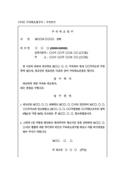 주요내용 : 피고인이 구속된 후 구속취소사유가 없거나 그 사유가 소멸되었을 때(구속만기 등) 법원에 구속의 취소를 구하기 위한 목적으로 사용되어지는 청구서 양식임. 단 무단전재 방지목적으로 PDF 파일로 올리니, 구매하신 후 혹 원본 파일이 필요하신 분들은 톡이나 문자, 메일, 전화 등을 주시면 작성방법 등에 대한 간단한 무료상담과 함께 원본 파일을 보내드리도록 하겠습니다.