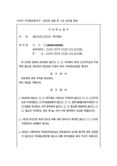 주요내용 : 피고인이 구속된 후 구속의 사유가 없거나 그 사유가 소멸되었을 때 당해 피고인에 대하여 법원에 구속의 취소를 구하기 위한 목적으로 사용되어지는 청구서 양식임. 단 무단전재 방지목적으로 PDF 파일로 올리니, 구매하신 후 혹 원본 파일이 필요하신 분들은 톡이나 문자, 메일, 전화 등을 주시면 작성방법 등에 대한 간단한 무료상담과 함께 원본 파일을 보내드리도록 하겠습니다.
