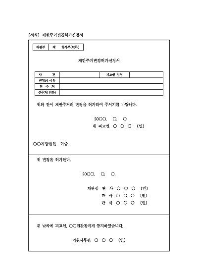주요내용 : 형사 사건에서 법원이 부과한 주거 제한 조건을 변경해 달라고 법원에 요청하는 서류로써, 이 서류는 주로 구속된 피고인이 법원의 허가 없이 지정된 주거지 밖으로 이동해야 할 때 제출하는 서류 양식임. 단 무단전재 방지목적으로 PDF 파일로 올리니, 구매하신 후 혹 원본 파일이 필요하신 분들은 톡이나 문자, 메일, 전화 등을 주시면 작성방법 등에 대한 간단한 무료상담과 함께 원본 파일을 보내드리도록 하겠습니다.