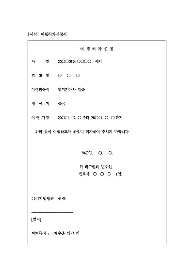 주요내용 : 재판의 계류 중인 불구속피고인이 사업상 등의 사유(여행목적란에 구체적인 사유 및 증거, 출국일 및 귀국일 등을 구체적으로 기재해야 함)로 해외를 여행하여야 할 반드시 법원의 여행허가를 득해야 하는데 그때 사용되어지는 양식임. 단 무단전재 방지목적으로 PDF 파일로 올리니, 구매하신 후 혹 원본 파일이 필요하신 분들은 톡이나 문자, 메일, 전화 등을 주시면 작성방법 등에 대한 간단한 무료상담과 함께 원본 파일을 보내드리도록 하겠습니다.