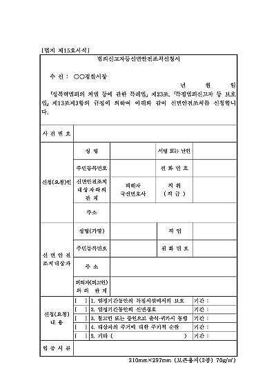 주요내용 : 범죄를 신고하거나 목격하는 등 수사과정에 참여한 사람이 가해자로부터 보복을 받을 우려가 있을 때, 경찰에 신변 안전 조치를 요청하는 데 사용되어지는 신청서 양식임. 단 무단전재 방지목적으로 PDF 파일로 올리니, 구매하신 후 혹 원본 파일이 필요하신 분들은 톡이나 문자, 메일, 전화 등을 주시면 작성방법 등에 대한 간단한 무료상담과 함께 원본 파일을 보내드리도록 하겠습니다.