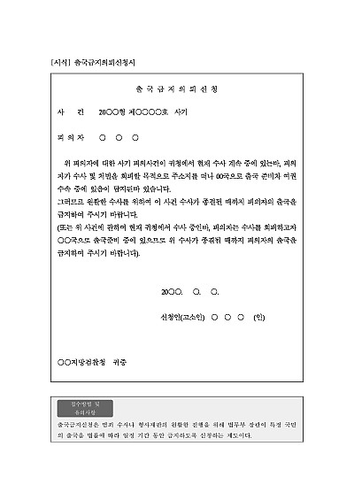 주요내용 : 수사회피를 막고 재판절차를 이행하게 할 목적으로 수사나 재판중인 특정인의 출국을 법률에 따라 일정기간 금지하도록 할 신청할 때 사용되어지는 양식임. 단 무단전재 방지목적으로 PDF 파일로 올리니, 구매하신 후 혹 원본 파일이 필요하신 분들은 톡이나 문자, 메일, 전화 등을 주시면 작성방법 등에 대한 간단한 무료상담과 함께 원본 파일을 보내드리도록 하겠습니다.