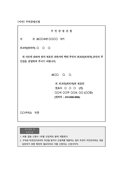 주요내용 : 구치소나 교도소 등 교정시설에 수감된 피고인이 직접 날인이 어려울 때, 교도관이 피고인의 무인이 본인 것인을 확인해 주기 위한 목적으로 사용되어지는 신청서 양식임. 단 무단전재 방지목적으로 PDF 파일로 올리니구매하신 후 혹 원본 파일이 필요하신 분들은 톡이나 문자메일전화 등을 주시면 작성방법 등에 대한 간단한 무료상담과 함께 원본 파일을 보내드리도록 하겠습니다.