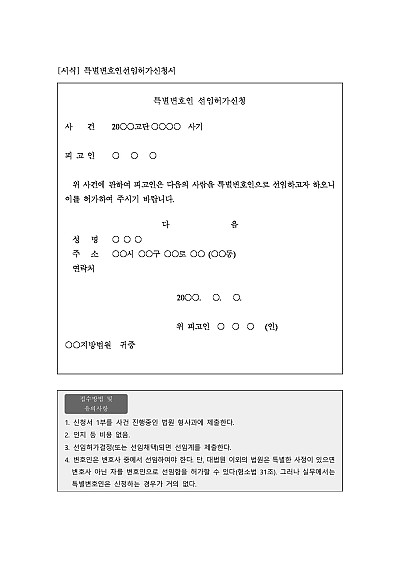 주요내용 : 일반적인 경우 변호사는 변호사 중에 선임하여야 하지만, 특별변호인 선임의 경우 법률전문가가 아닌 사람을 변호인으로 선임하기 위한 목적으로 사용되어지는 신청서 양식임. 단 무단전재 방지목적으로 PDF 파일로 올리니, 구매하신 후 혹 원본 파일이 필요하신 분들은 톡이나 문자, 메일, 전화 등을 주시면 작성방법 등에 대한 간단한 무료상담과 함께 원본 파일을 보내드리도록 하겠습니다