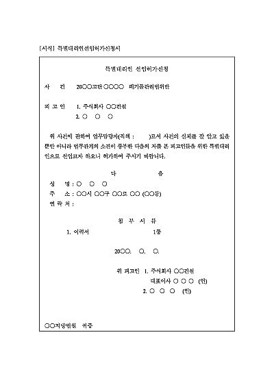 주요내용 : 피고인 또는 피의자를 대리하거나 대표할 사람이 없는 경우 법원에 특정인을 특별대리인으로 선해줄 것을 청구하기 위한 목적으로 사용되어지는 신청서 양식임. 단 무단전재 방지목적으로 PDF 파일로 올리니, 구매하신 후 혹 원본 파일이 필요하신 분들은 톡이나 문자, 메일, 전화 등을 주시면 작성방법 등에 대한 간단한 무료상담과 함께 원본 파일을 보내드리도록 하겠습니다.