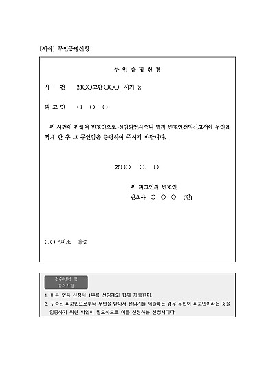 주요내용 : 구치소나 교도소 등 교정시설에 수감된 피고인이 직접 날인이 어려울 때, 교도관이 피고인의 무인이 본인 것인을 확인해 주기 위한 목적으로 사용되어지는 신청서 양식임. 단 무단전재 방지목적으로 PDF 파일로 올리니, 구매하신 후 혹 원본 파일이 필요하신 분들은 톡이나 문자, 메일, 전화 등을 주시면 작성방법 등에 대한 간단한 무료상담과 함께 원본 파일을 보내드리도록 하겠습니다.