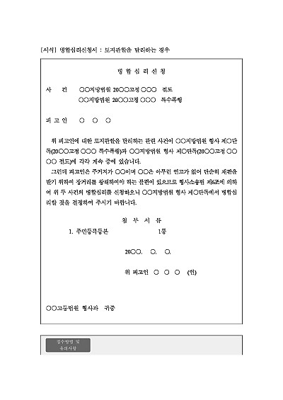 주요내용 : 서로 다른 법원에 계속되어 있는 관련 형사사건들을 하나의 법원에서 같이 심리해 줄 것을 신청할 것을 목적으로 사용되어지는 신청서 양식임. 단 무단전재 방지목적으로 PDF 파일로 올리니, 구매하신 후 혹 원본 파일이 필요하신 분들은 톡이나 문자, 메일, 전화 등을 주시면 작성방법 등에 대한 간단한 무료상담과 함께 원본 파일을 보내드리도록 하겠습니다