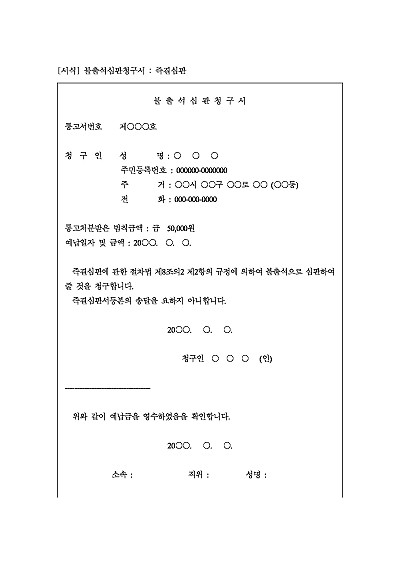 주요내용 : 즉결심판출석통지를 받은 자가 법원에 불출석심판을 청구할 때 사용되어지는 청구서 양식임. 단 무단전재 방지목적으로 PDF 파일로 올리니, 구매하신 후 혹 원본 파일이 필요하신 분들은 톡이나 문자, 메일, 전화 등을 주시면 작성방법 등에 대한 간단한 무료상담과 함께 원본 파일을 보내드리도록 하겠습니다.