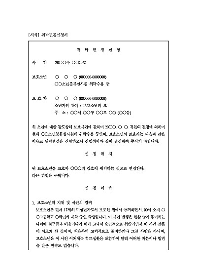 주요내용 소년보호사건에서 법원이 소년을 특정 시설에 위탁(임시조치)한 후, 그 위탁 상태를 취소하거나 다른 보호처분으로 변경해달라고 법원에 신청할 목적으로 사용되어지는 신청서 양식임단 무단전재 방지목적으로 PDF 파일로 올리니구매하신 후 혹 원본 파일이 필요하신 분들은 톡이나 문자메일전화 등을 주시면 작성방법 등에 대한 간단한 무료상담과 함께 원본 파일을 보내드리도록 하겠습니다.