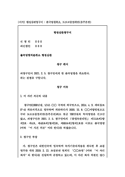 주요내용 : 외국인이 법령 위반 등으로 출입국관리소로부터 받은 '출국명령' 처분이 부당하다고 생각할 때, 행정심판 제도를 통해 그 처분의 취소 또는 변경을 구하기 위한 목적으로 사용되어지는 청구서 양식임. 단 무단전재 방지목적으로 PDF 파일로 올리니, 구매하신 후 혹 원본 파일이 필요하신 분들은 톡이나 문자, 메일, 전화 등을 주시면 작성방법 등에 대한 간단한 무료상담과 함께 원본 파일을 보내드리도록 하겠습니다.