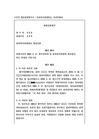 주요내용 : 외국인이 법령 위반 등으로 출입국관리소로부터 받은 '강제퇴거명령' 처분이 부당하다고 생각할 때, 행정심판 제도를 통해 그 처분의 취소 또는 변경을 구하기 위한 목적으로 사용되어지는 청구서 양식임. 단 무단전재 방지목적으로 PDF 파일로 올리니, 구매하신 후 혹 원본 파일이 필요하신 분들은 톡이나 문자, 메일, 전화 등을 주시면 작성방법 등에 대한 간단한 무료상담과 함께 원본 파일을 보내드리도록 하겠습니다.