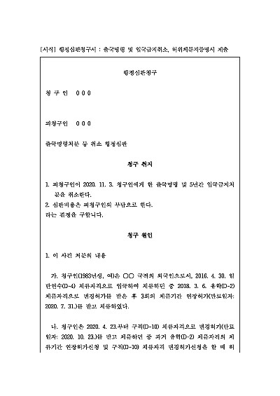 행정심판청구서 : 출국명령 및 입국금지취소, 허위체류지증명서 제출 요약정보 및 구매