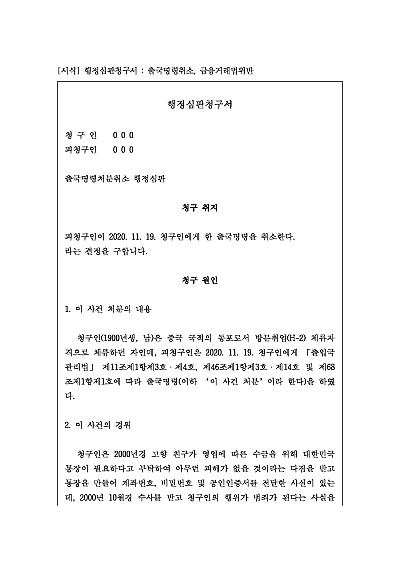 주요내용 : 외국인이 법령 위반 등으로 출입국관리소로부터 받은 '출국명령' 처분이 부당하다고 생각할 때, 행정심판 제도를 통해 그 처분의 취소 또는 변경을 구하기 위한 목적으로 사용되어지는 청구서 양식임. 단 무단전재 방지목적으로 PDF 파일로 올리니, 구매하신 후 혹 원본 파일이 필요하신 분들은 톡이나 문자, 메일, 전화 등을 주시면 작성방법 등에 대한 간단한 무료상담과 함께 원본 파일을 보내드리도록 하겠습니다.
