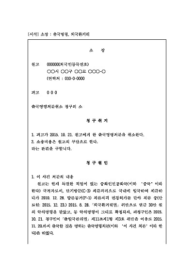 주요내용 외국인에게 내려진 출입국관리법상 출국명령 처분이 위법하다고 판단될 때, 이를 취소해달라고 법원에 관련 소를 제기할 때 사용되어지는 양식임단 무단전재 방지목적으로 PDF 파일로 올리니구매하신 후 혹 원본 파일이 필요하신 분들은 톡이나 문자메일전화 등을 주시면 작성방법 등에 대한 간단한 무료상담과 함께 원본 파일을 보내드리도록 하겠습니다.