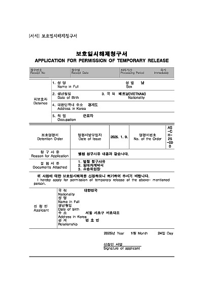 주요내용 : 보호일시해제는 외국인보호소에 보호 중인 외국인이 인도주의적 사유나 재산 정리 등 특정 조건 하에 일시적으로 보호에서 벗어나 외부에서 생활하도록 허가하는 제도임. 단 무단전재 방지목적으로 PDF 파일로 올리니, 구매하신 후 혹 원본 파일이 필요하신 분들은 톡이나 문자, 메일, 전화 등을 주시면 작성방법 등에 대한 간단한 무료상담과 함께 원본 파일을 보내드리도록 하겠습니다.