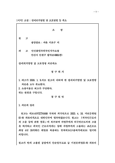 주요내용 :출입국관리법 위반 등으로 대한민국 출국 명령을 받은 외국인이 자진하여 출국하지 않고 한국에 체류할 수 있도록, 명령의 취소나 유예를 구하기 위해 행정심판이나 행정소송을 제기할 때 사용되어지는 소장 양식임. 단 무단전재 방지목적으로 PDF 파일로 올리니, 구매하신 후 혹 원본 파일이 필요하신 분들은 톡이나 문자, 메일, 전화 등을 주시면 작성방법 등에 대한 간단한 무료상담과 함께 원본 파일을 보내드리도록 하겠습니다.