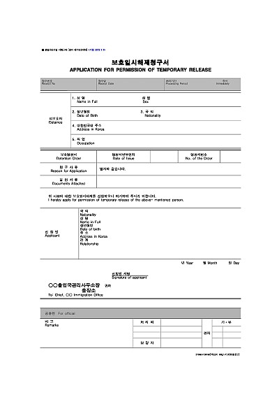 주요내용 : 보호일시해제신청은 지방출입국‧외국인관서의 장이 직권으로 또는 보호시설에 보호되어 있는 외국인(이하“보호외국인”이라고 함)의 청구에 따라, 보호외국인의 정상, 해제요청사유, 자산, 그 밖의 사항을 고려하여 2천만 원 이하의 보증금을 예치시키고 주거의 제한이나 그 밖에 필요한 조건을 붙여 보호를 일시해제할 수 있는 제도를 말합니다.