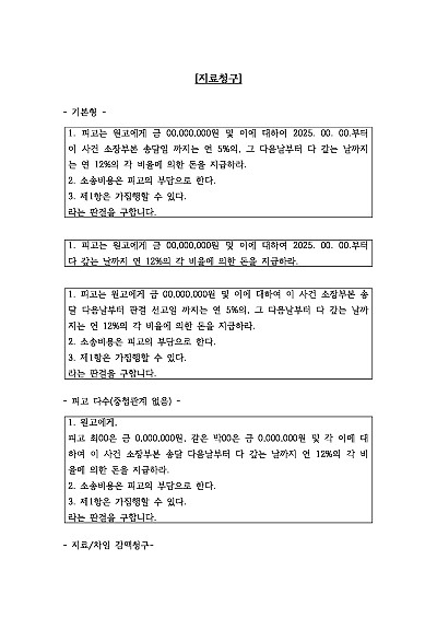 기본형, 피고 다수, 지료 차임 감액청구 등 공사대금 청구 관련 청구취지 기재, 단 무단전재 방지목적으로 PDF 파일로 올리니, 혹 원본 파일이 필요하신 분들은 톡이나 문자, 메일, 전화 등을 주시면 작성방법에 대한 간단한 상담과 함께 원본 파일을 보내드리도록 하겠습니다.