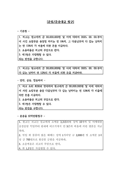 기본형, 연대청구 등, 운송물 위탁반환청구 등 공사대금 청구 관련 청구취지 기재, 단 무단전재 방지목적으로 PDF 파일로 올리니, 혹 원본 파일이 필요하신 분들은 톡이나 문자, 메일, 전화 등을 주시면 작성방법에 대한 간단한 상담과 함께 원본 파일을 보내드리도록 하겠습니다.