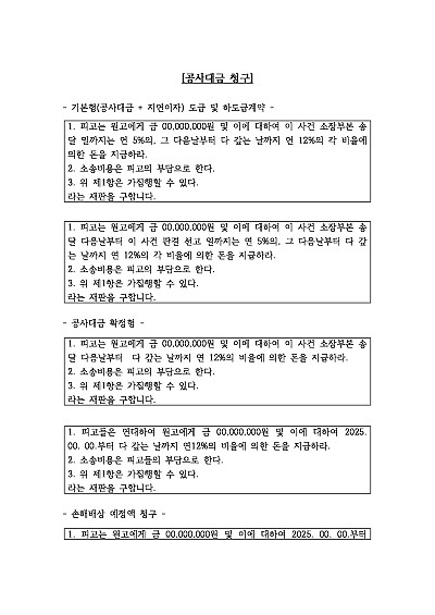공사대금 청구취지, 기본형(공사대금+지연이자) 도급 및 하도급 계약, 공사대금 확정형, 손해배상 예정액 청구, 공사대금(피고의 의무 중첩관계가 없는 경우 / 피고의 의무 중첩관계 있는 경우) 등 공사대금 관련 청구취지 기재, 단 무단전재 방지목적으로 PDF 파일로 올리니, 혹 원본 파일이 필요하신 분들은 톡이나 문자, 메일, 전화 등을 주시면 작성방법에 대한 간단한 상담과 함께 원본 파일을 보내드리도록 하겠습니다.