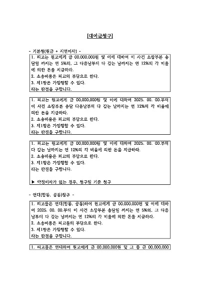 기본형(원금+지연이자), 연대 청구, 원피고 다수, 대여증여/주권인도 대상청구/기산일 상이 등 혼합형, 소멸시효 중단 목적, 채무부존재확인 등 대여금청구 관련 청구취지 기재, 단 무단전재 방지목적으로 PDF 파일로 올리니, 혹 원본 파일이 필요하신 분들은 톡이나 문자, 메일, 전화 등을 주시면 작성방법에 대한 간단한 상담과 함께 원본 파일을 보내드리도록 하겠습니다.