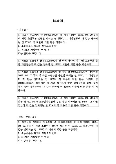 기본형, 연대청구 등, 원고다수, 동시이행 등 보증금 관련 청구취지 기재, 단 무단전재 방지목적으로 PDF 파일로 올리니, 혹 원본 파일이 필요하신 분들은 톡이나 문자, 메일, 전화 등을 주시면 작성방법에 대한 간단한 상담과 함께 원본 파일을 보내드리도록 하겠습니다.