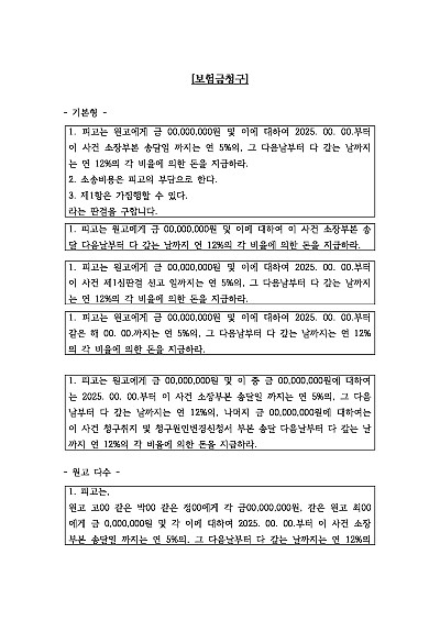 기본형, 원고 다수, 연대 청구 등, 채무부존재확인 등 보험금청구 관련 청구취지 기재, 단 무단전재 방지목적으로 PDF 파일로 올리니, 혹 원본 파일이 필요하신 분들은 톡이나 문자, 메일, 전화 등을 주시면 작성방법에 대한 간단한 상담과 함께 원본 파일을 보내드리도록 하겠습니다.