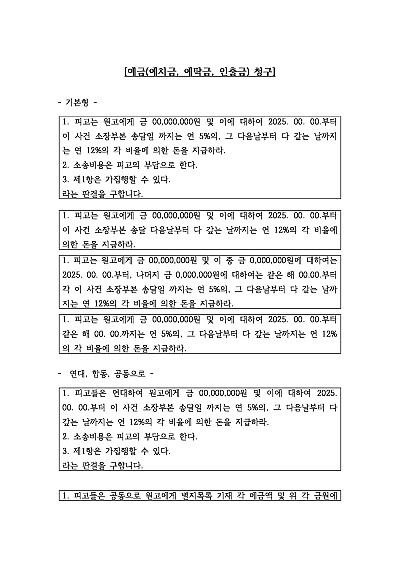 기본형, 연대청구, 원고 다수, 예탁금소유확인 등 예금 청구 관련 청구취지 기재, 단 무단전재 방지목적으로 PDF 파일로 올리니, 혹 원본 파일이 필요하신 분들은 톡이나 문자, 메일, 전화 등을 주시면 작성방법에 대한 간단한 상담과 함께 원본 파일을 보내드리도록 하겠습니다.