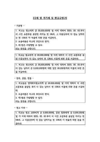 기본형, 연대청구, 원고 다수 등 국세 및 부가세 청구 관련 청구취지 기재, 단 무단전재 방지목적으로 PDF 파일로 올리니, 혹 원본 파일이 필요하신 분들은 톡이나 문자, 메일, 전화 등을 주시면 작성방법에 대한 간단한 상담과 함께 원본 파일을 보내드리도록 하겠습니다.