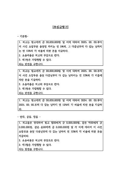 기본형, 연대청구 등 추심금 청구 관련 청구취지 기재, 단 무단전재 방지목적으로 PDF 파일로 올리니, 혹 원본 파일이 필요하신 분들은 톡이나 문자, 메일, 전화 등을 주시면 작성방법에 대한 간단한 상담과 함께 원본 파일을 보내드리도록 하겠습니다.