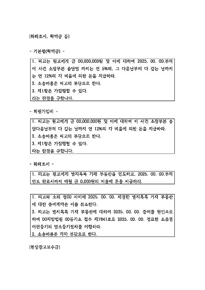 기본형, 회원가입비, 화해보서, 현상광고보수금 등 청구 관련 청구취지 기재, 단 무단전재 방지목적으로 PDF 파일로 올리니, 혹 원본 파일이 필요하신 분들은 톡이나 문자, 메일, 전화 등을 주시면 작성방법에 대한 간단한 상담과 함께 원본 파일을 보내드리도록 하겠습니다.