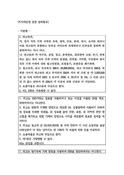 기본형 등 지식재산권침해 관련 손배 청구 관련 청구취지 기재, 단 무단전재 방지목적으로 PDF 파일로 올리니, 혹 원본 파일이 필요하신 분들은 톡이나 문자, 메일, 전화 등을 주시면 작성방법에 대한 간단한 상담과 함께 원본 파일을 보내드리도록 하겠습니다.