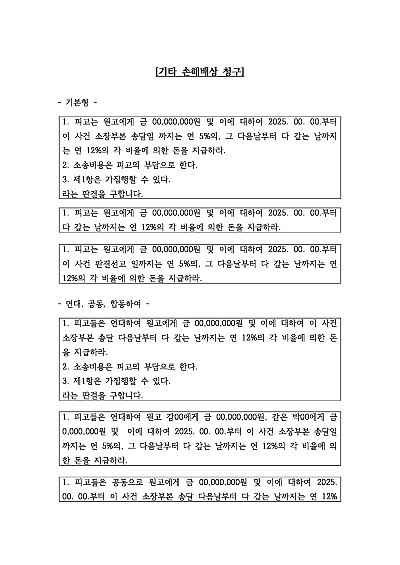 기본형, 연대청구 등, 원고 다수, 기산일이 다른 경우 등 손해배상 청구 관련 청구취지 기재, 단 무단전재 방지목적으로 PDF 파일로 올리니, 혹 원본 파일이 필요하신 분들은 톡이나 문자, 메일, 전화 등을 주시면 작성방법 등에 대한 간단한 무료상담과 함께 원본 파일을 보내드리도록 하겠습니다.