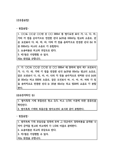 현물분할, 공유관계확인, 가격보상에 의한 현물분할, 경매청구 등 공유물분할 청구 관련 청구취지 기재, 단 무단전재 방지목적으로 PDF 파일로 올리니, 혹 원본 파일이 필요하신 분들은 톡이나 문자, 메일, 전화 등을 주시면 작성방법 등에 대한 간단한 무료상담과 함께 원본 파일을 보내드리도록 하겠습니다.
