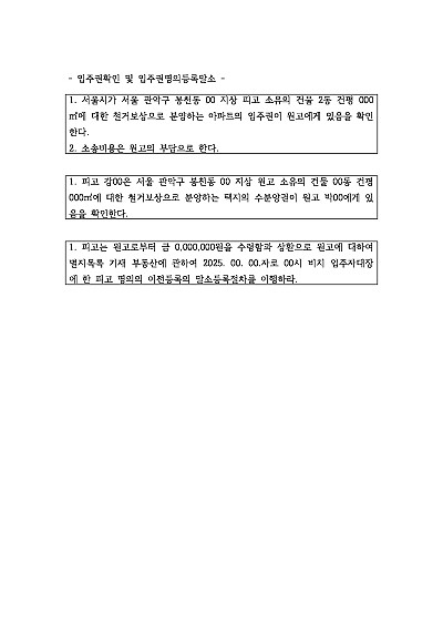 기본형 등 입주원확인 및 입주권명의등록말소 청구 관련 청구취지 기재, 단 무단전재 방지목적으로 PDF 파일로 올리니, 혹 원본 파일이 필요하신 분들은 톡이나 문자, 메일, 전화 등을 주시면 작성방법 등에 대한 간단한 무료상담과 함께 원본 파일을 보내드리도록 하겠습니다