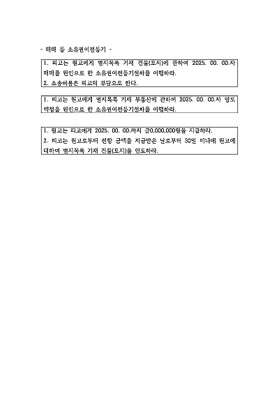 기본형 등 매매 등 소유권이전등기 청구 관련 청구취지 기재, 단 무단전재 방지목적으로 PDF 파일로 올리니, 혹 원본 파일이 필요하신 분들은 톡이나 문자, 메일, 전화 등을 주시면 작성방법 등에 대한 간단한 무료상담과 함께 원본 파일을 보내드리도록 하겠습니다.
