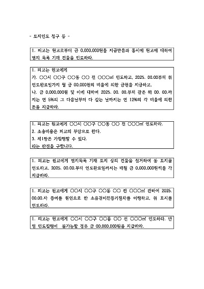 기본형 등 토지인도 청구 관련 청구취지 기재, 단 무단전재 방지목적으로 PDF 파일로 올리니, 혹 원본 파일이 필요하신 분들은 톡이나 문자, 메일, 전화 등을 주시면 작성방법 등에 대한 간단한 무료상담과 함께 원본 파일을 보내드리도록 하겠습니다.