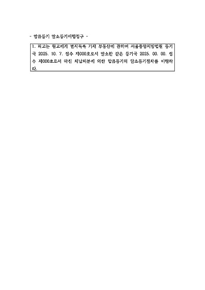 기본형 등 압류등기 말소등기절차 이행 청구 관련 청구취지 기재, 단 무단전재 방지목적으로 PDF 파일로 올리니, 혹 원본 파일이 필요하신 분들은 톡이나 문자, 메일, 전화 등을 주시면 작성방법 등에 대한 간단한 무료상담과 함께 원본 파일을 보내드리도록 하겠습니다.