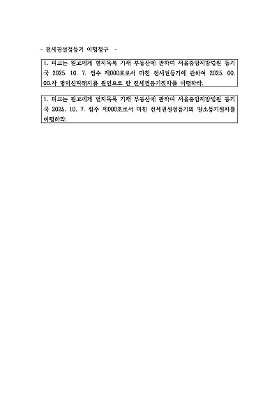 기본형 등 전세권설정등기이행 청구 관련 청구취지 기재, 단 무단전재 방지목적으로 PDF 파일로 올리니, 혹 원본 파일이 필요하신 분들은 톡이나 문자, 메일, 전화 등을 주시면 작성방법 등에 대한 간단한 무료상담과 함께 원본 파일을 보내드리도록 하겠습니다.