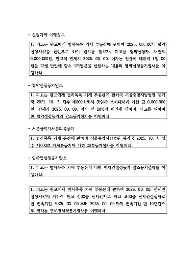 설정계약이행등기, 협약설정등기말소, 임차권설정등기말소, 처분금지기처분회복등기 등 청구취지 기재, 단 무단전재 방지목적으로 PDF 파일로 올리니, 혹 원본 파일이 필요하신 분들은 톡이나 문자, 메일, 전화 등을 주시면 작성방법 등에 대한 간단한 무료상담과 함께 원본 파일을 보내드리도록 하겠습니다.