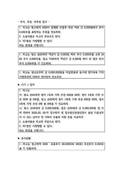 기본형, 사기 강박, 주식반환, 인수무효 등, 상장폐지결정무효, 비주주확인, 주식질권소멸, 명의개서, 주권발행, 양도계약, 신주배정이행, 사원의 회사해산, 파산채권확정의 소 청구 관련 청구취지 기재, 단 무단전재 방지목적으로 PDF 파일로 올리니, 혹 원본 파일이 필요하신 분들은 톡이나 문자, 메일, 전화 등을 주시면 작성방법 등에 대한 간단한 무료상담과 함께 원본 파일을 보내드리도록 하겠습니다.