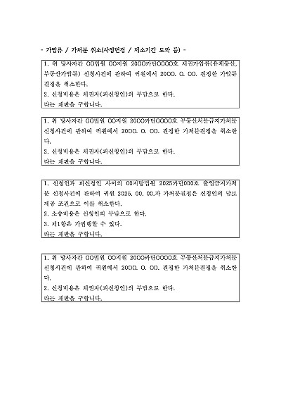 가압류, 가처분취소(사정변경, 제소기간 도과 등) 신청취지 기재, 단 무단전재 방지목적으로 PDF 파일로 올리니, 혹 원본 파일이 필요하신 분들은 톡이나 문자, 메일, 전화 등을 주시면 작성방법 등에 대한 간단한 무료상담과 함께 원본 파일을 보내드리도록 하겠습니다.