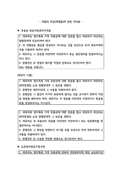 점유이전금지가처분, 처분금지가처분, 소유권이전등기청구권, 현상변경 등 다툼의 대상(계쟁물)에 관한 가처분 관련 신청취지 기재, 단 무단전재 방지목적으로 PDF 파일로 올리니, 혹 원본 파일이 필요하신 분들은 톡이나 문자, 메일, 전화 등을 주시면 작성방법 등에 대한 간단한 무료상담과 함께 원본 파일을 보내드리도록 하겠습니다.