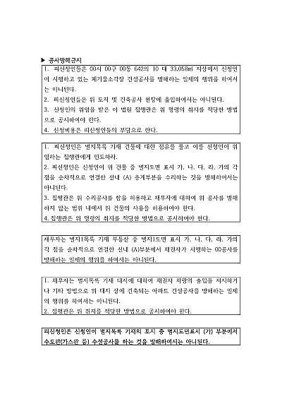 공사방해금지 가처분 관련 신청취지 기재, 단 무단전재 방지목적으로 PDF 파일로 올리니, 혹 원본 파일이 필요하신 분들은 톡이나 문자, 메일, 전화 등을 주시면 작성방법 등에 대한 간단한 무료상담과 함께 원본 파일을 보내드리도록 하겠습니다.