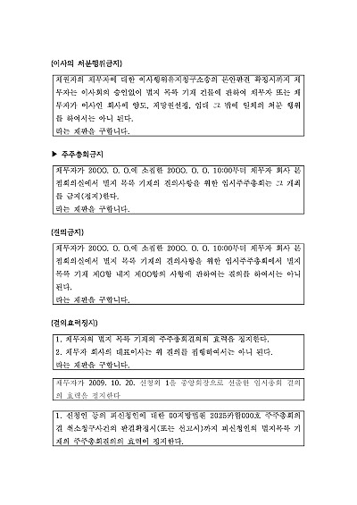 이사의 처분행위금지, 주주총회금지, 결의금지, 결의효력정지, 결의집행정지, 소집금지 등 가처분 신청취지 기재, 단 무단전재 방지목적으로 PDF 파일로 올리니, 혹 원본 파일이 필요하신 분들은 톡이나 문자, 메일, 전화 등을 주시면 작성방법 등에 대한 간단한 무료상담과 함께 원본 파일을 보내드리도록 하겠습니다.