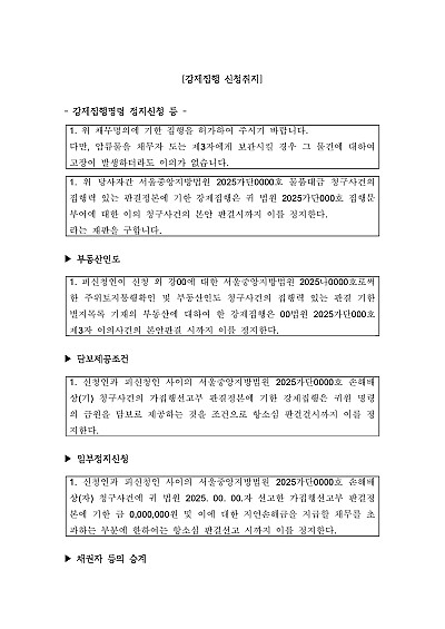 강제집행명령 정지신청, 부동산인도, 당보제공조건변경, 일부정지신청, 채권자 등 승계, 집행문부(수통)여신청, 집행문부여의 소 등 강제집행 관련 신청취지 기재, 단 무단전재 방지목적으로 PDF 파일로 올리니, 혹 원본 파일이 필요하신 분들은 톡이나 문자, 메일, 전화 등을 주시면 작성방법 등에 대한 간단한 무료상담과 함께 원본 파일을 보내드리도록 하겠습니다.