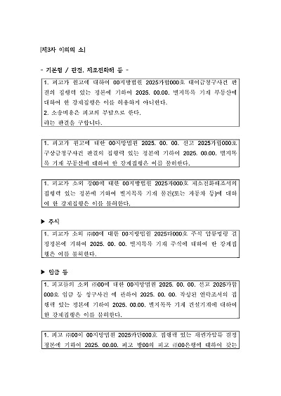 기본형, 주식, 임금, 소유권이전등기, 임의경매, 부동산, 유채동산, 집행에 관한 이의신청, 집행정지신청 등 제3자 이의의 소 관련 청구취지 기재, 단 무단전재 방지목적으로 PDF 파일로 올리니, 혹 원본 파일이 필요하신 분들은 톡이나 문자, 메일, 전화 등을 주시면 작성방법 등에 대한 간단한 무료상담과 함께 원본 파일을 보내드리도록 하겠습니다.