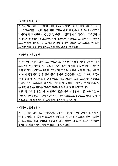 부동산재평가, 매각조건변경, 매각부동산매수신청 관련 신청취지 기재, 단 무단전재 방지목적으로 PDF 파일로 올리니, 혹 원본 파일이 필요하신 분들은 톡이나 문자, 메일, 전화 등을 주시면 작성방법 등에 대한 간단한 무료상담과 함께 원본 파일을 보내드리도록 하겠습니다.